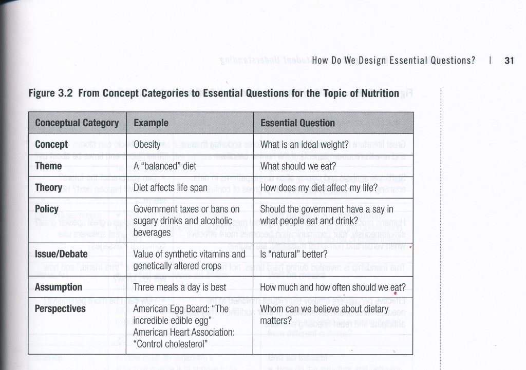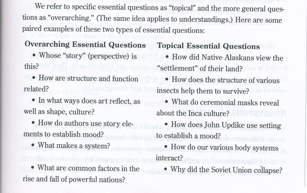 En omdat de hele module er onder dient te passen, voorbeelden van overkoepelende essentiële vragen vs per topic. (pg 9)