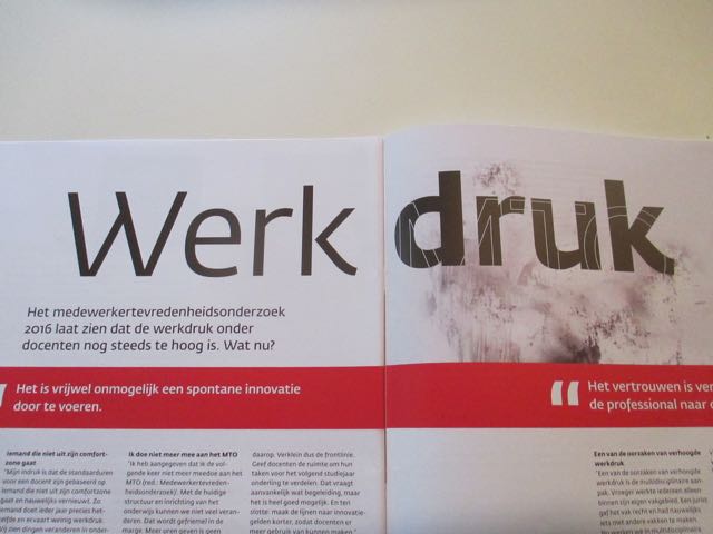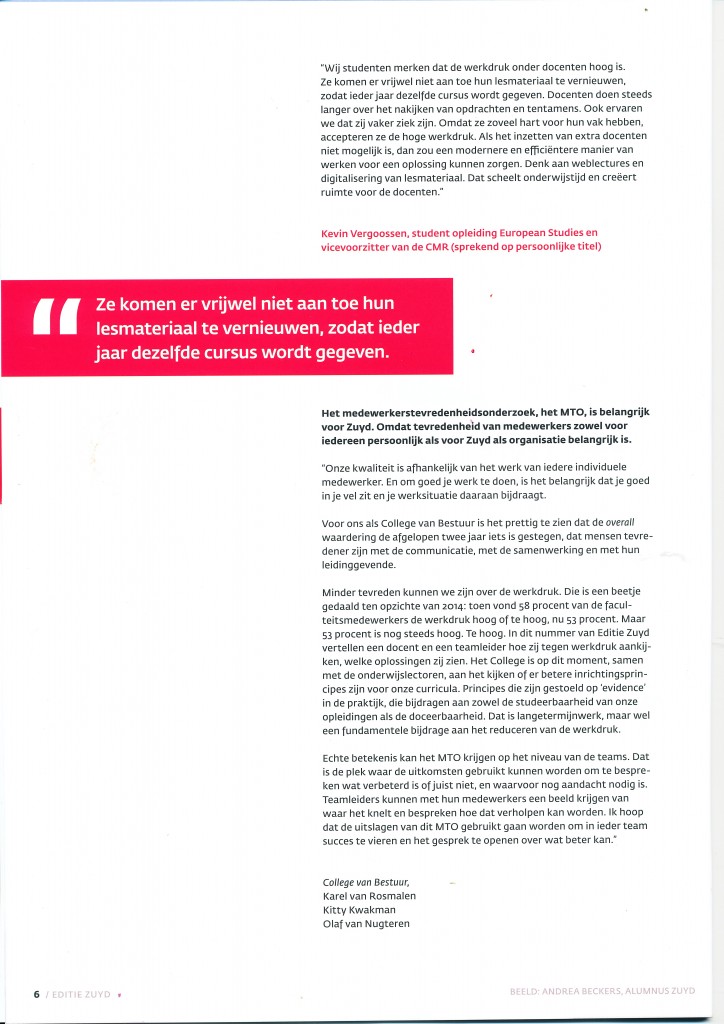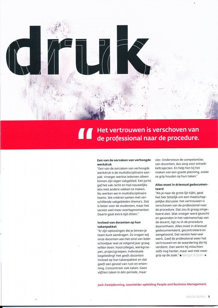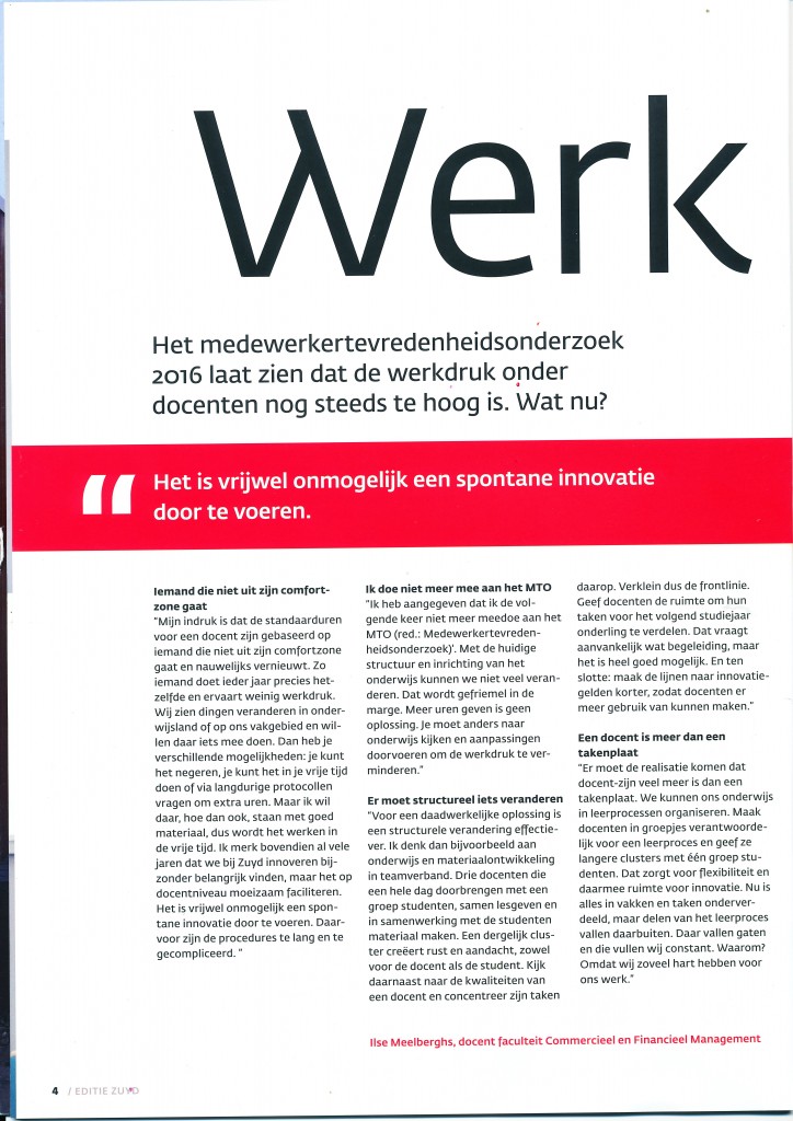 In een interview voor “werken voor Zuyd” kwam werkdruk ter sprake. Een onderwerp waarover ik best gepassioneerd kan vertellen, een mening over heb. Of ik daarover ook zou willen vertellen voor het blad van Zuyd. Dat heb ik dus gedaan. Ik ben blij met het overzicht dat het hele artikel geeft. Blij ook met de student die vanuit zijn perspectief hetzelfde ziet als wij. En blij ook dat ik blog. Daar mag je zoveel woorden gebruiken als je wil 🙂